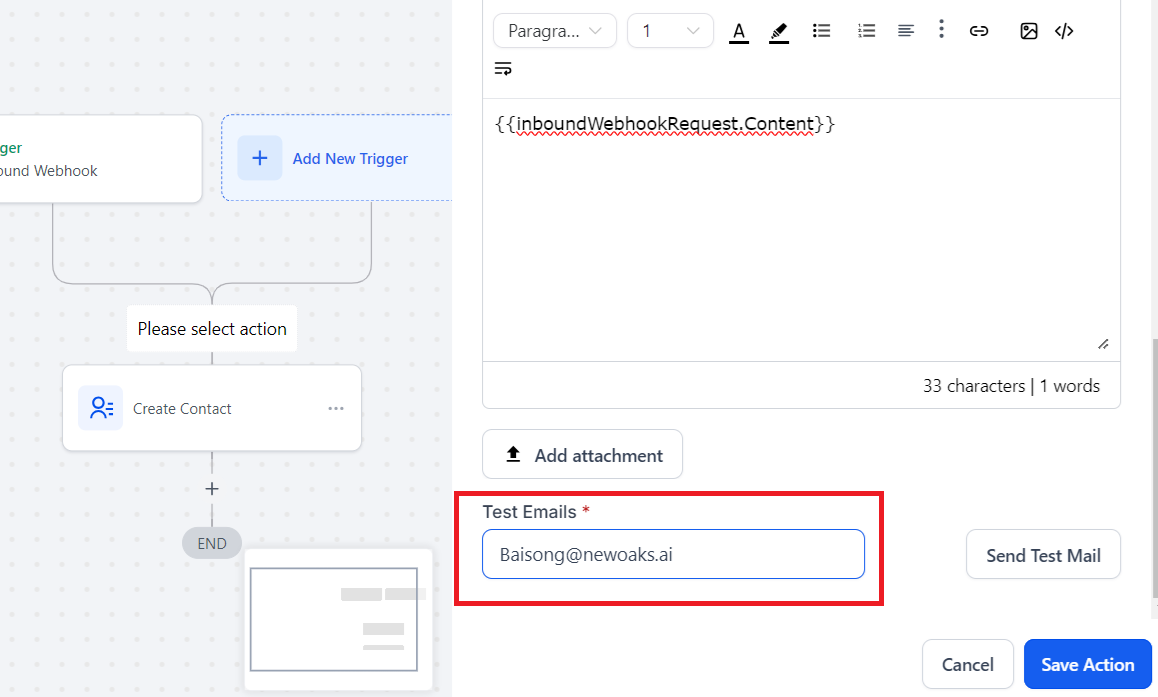 1. Click “+” on the workflow builder panel to add an action, Find “Send Email” action and click “Send Email”