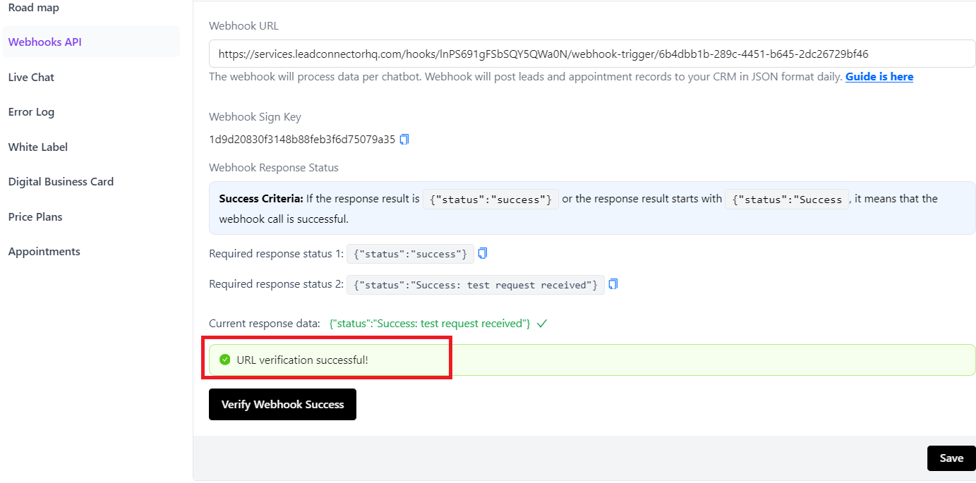 click “Verify Webhook Success” button, it will display “URL verification successful!” text, then click “Save” button